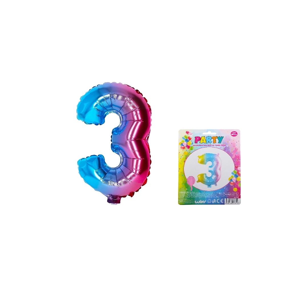 Dětský duhový nafukovací balónek ve tvaru čísla 3 je vhodný jako doplněk na narozeninovou párty. Velikost 40 cm