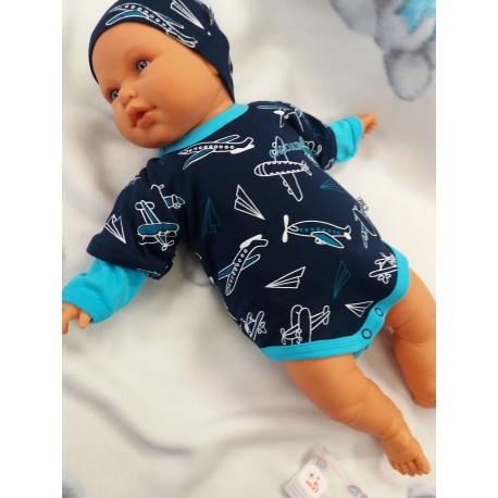 Dojčenské body s dlhým rukávom a potlačou letadýlek Naše malé ERO. Tmavo modrá farba. Bodmi je z kvalitného materiálu 100% bavlna. Dojčenské oblečenie má zapínanie na cvoky. Česká značka. Materiály sú testované a neobsahujú škodlivé látky, preto sú deti v bezpečí.