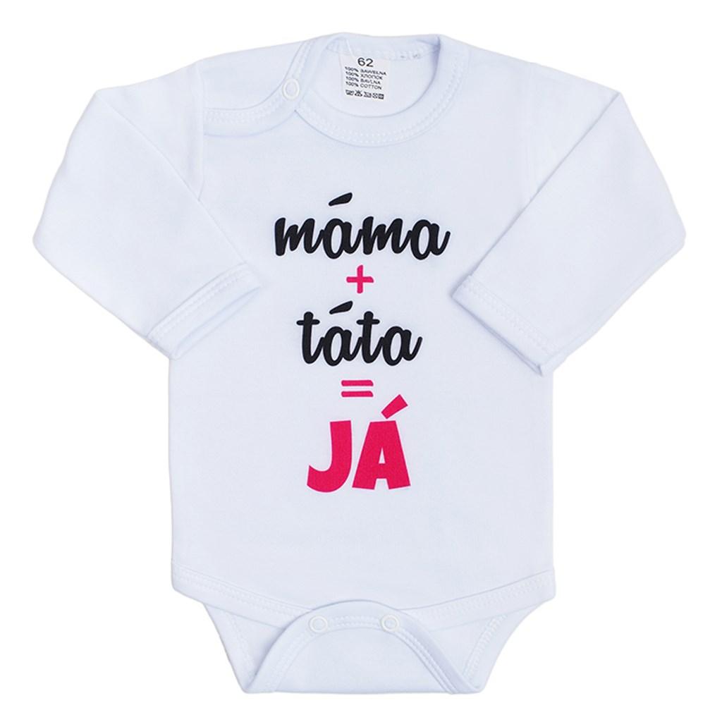 Originální bavlněné kojenecké body s dlouhým rukávem New Baby, s vtipným nápisem máma+táta=JÁ. Dárkové balení. Barvy použité k potisku jsou certifikované a vhodné pro miminka. Body má zapínáni na cvočky na ramínku a mezi nožičkami, což usnadňuje oblékání a přebalování. Oblečení je vyrobeno z kvalitního materiálu 100% bavlna. Produkt české značky.