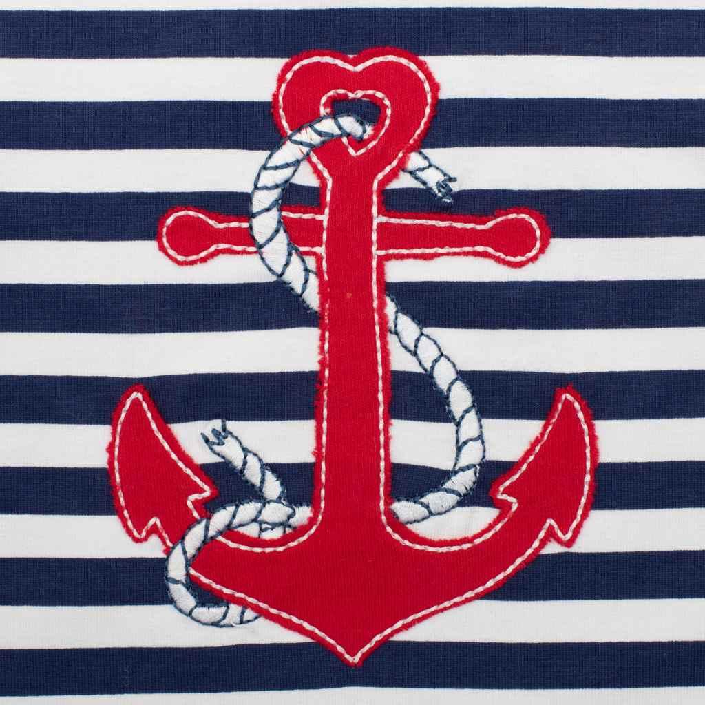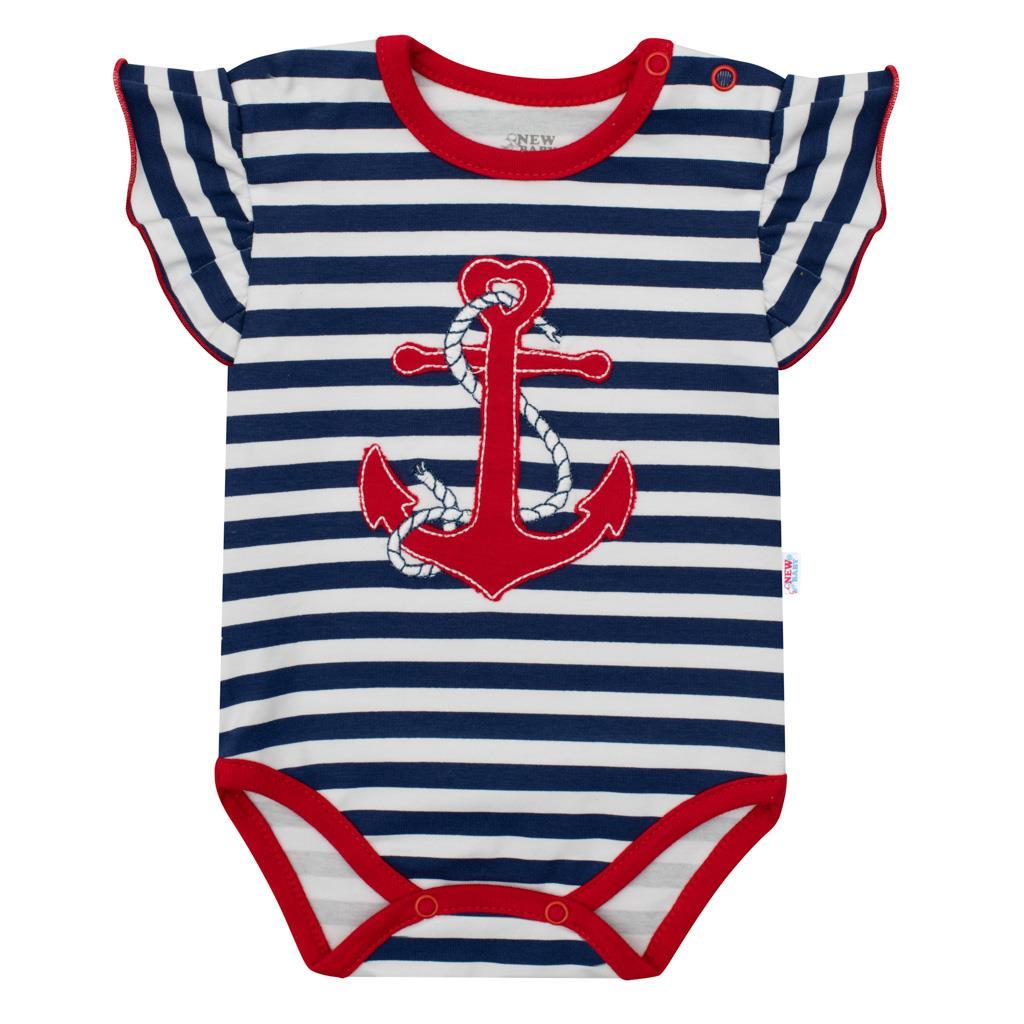 Letní bavlněné body s krátkým rukávem české značky New Baby Marine. Body s krátkým volánkovým rukávem je celopotištěné moderními pruhy s nášivkou kotvy. Nášivka je podlepená látkou proti poškrábání. Má praktické zapínání na cvočky na ramínku a mezi nožičkama, což usnadní oblékání a přebalování. Okolo krčku, nožiček a rukávů je barevné lemování. Super stylový letní motiv rozzáří každé miminko. Složení: 100% bavlna.