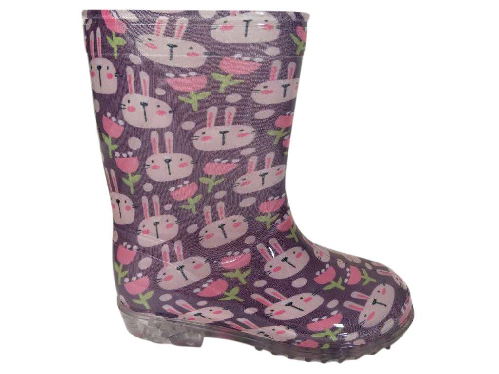 Dětské holínky jsou ve fialové barvě s obrázky zajíčka. Dětské gumáky mají kvalitní podrážku se vzorkem, textilní podšívku a vyjímatelnou stélku. Holínky budou děti potřebovat na vycházky. Boty pro dívky značky Pidilidi.