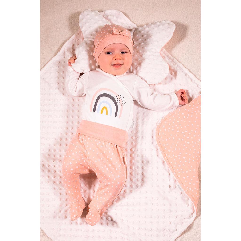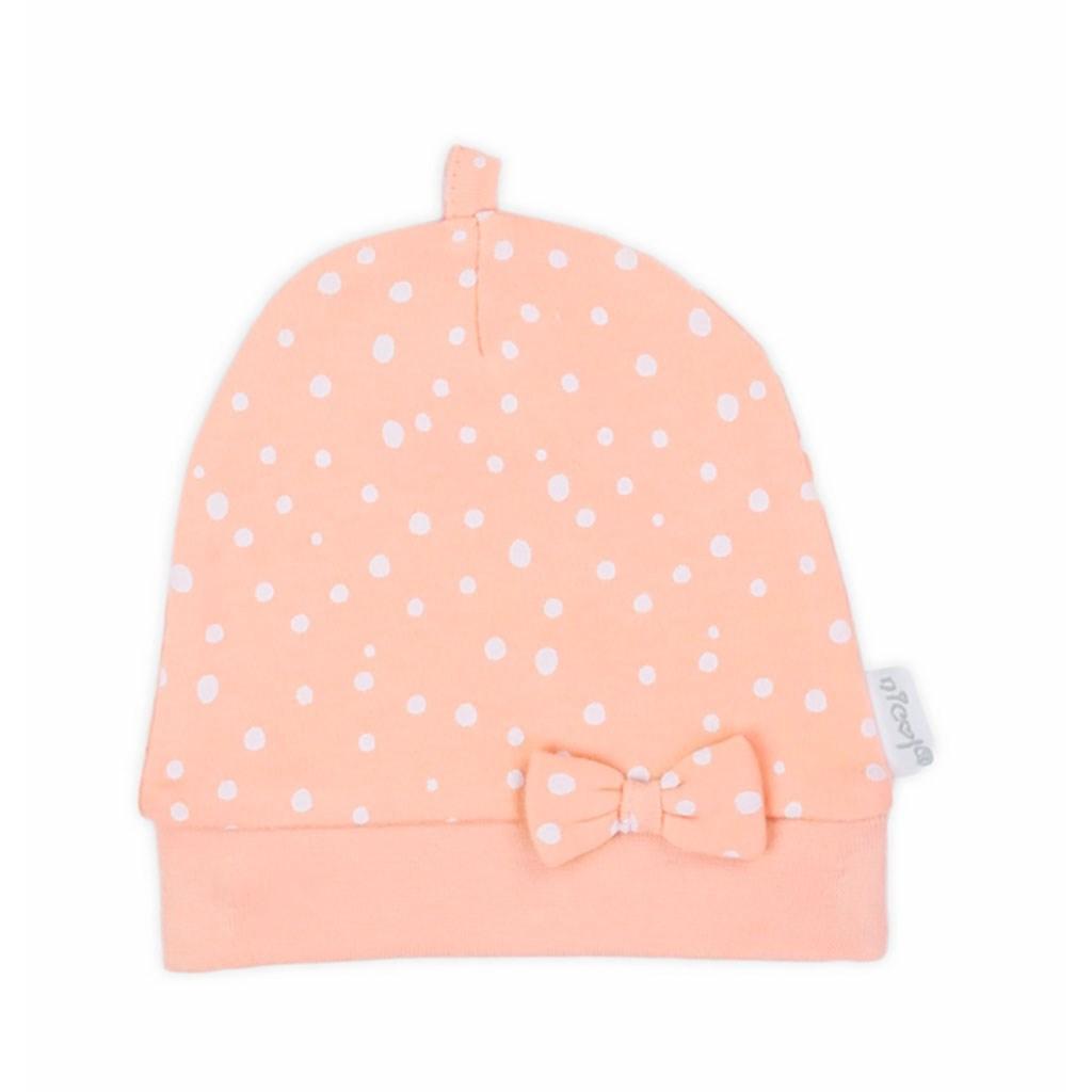 Čepička Nicol Rainbow. Čepička je celopotištěná puntíky s roztomilou mašličkou. Lem je široký a netlačí na hlavičku miminka. Rainbow je nová dechberoucí kolekce navržena s ohledem na potřeby našich nejmenších. Složení: 100% bavlna.