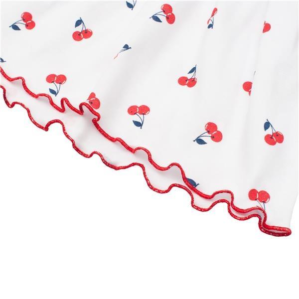 Kojenecké šaty české značky New Baby Cherry pro všechny malé parádnice. Šatičky s krátkým volánkovým rukávem celopotištěné třešničkami, jsou ušity ve tvaru písmene A. Vrchní část je zdobena nášivkou Cherry s třešničkami. Nášivka je podlepená proti poškrábání. Spodní část má krásně nařasenou sukýnku, která je celopotištěná třešničkami. Okolo krčku, rukávů a sukýnky je červené lemování. Zapínání na cvočky na zadní straně usnadní oblékání. Složení: 100% bavlna.