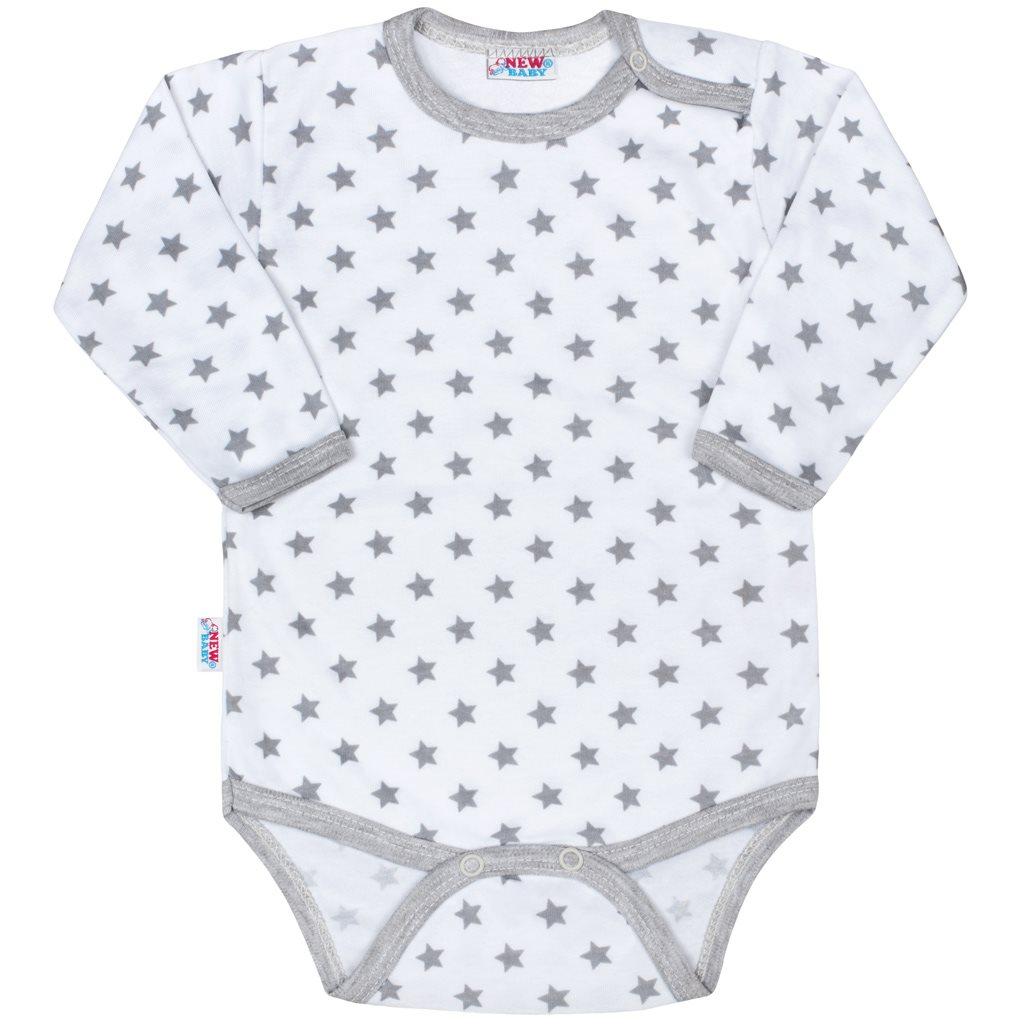 Kojenecké body New Baby Classic II. Body je v bílé barvě s šedými hvězdičkami. Zapíná se na cvočky na ramínku a mezi nožičkami. Kojenecké oblečení je vyrobené z kvalitního materiálu 100% bavlna.