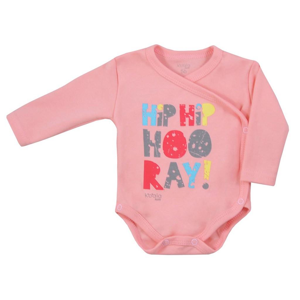 Kojenecké celorozepínací body Koala Hip-Hip. Růžové body je zdobeno nápisem. Zapíná se na cvočky po celé délce a mezi nožičkami, což usnadňuje oblékání a přebalování. Body je pro miminka důležitým kouskem oblečení. Při jakémkoliv pohybu jsou zádička miminka stále přikrytá. Kojenecké oblečení je z materiálu 100% bavlna.