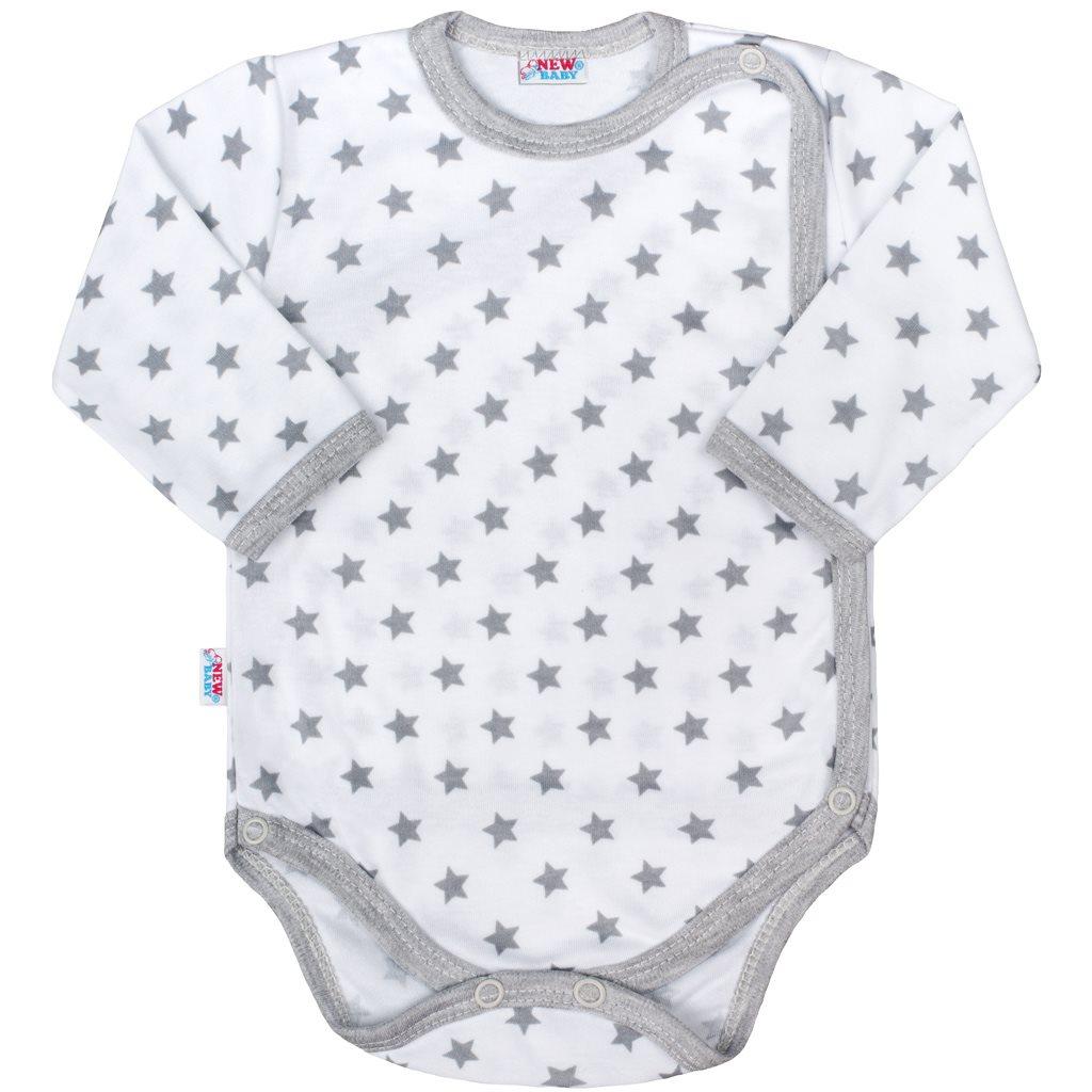 Kojenecké body New Baby Classic II. Body je v bílé barvě s šedými hvězdičkami. Zapíná se na cvočky po celé délce a mezi nožičkami, což usnadňuje oblékání a přebalování. Kojenecké oblečení je vyrobené z kvalitního a příjemného materiálu 100% bavlna.