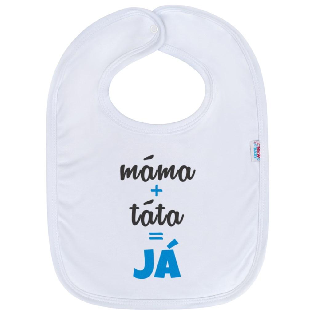 Krásný bavlněný dětský bryndáček zdobený nápisem máma+táta=JÁ. Zapínání na cvoček. Složení: 100 % bavlna. Rozměry: dxs cca 36x26 cm.