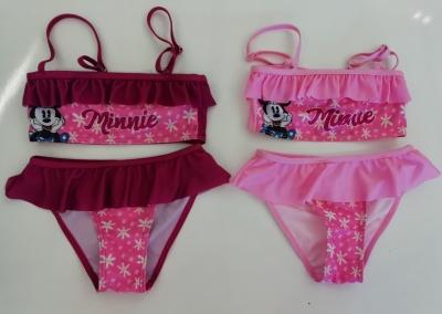 Dětské plavky s obrázkem myšky Minnie. Dvoudílné plavky jsou ve vínové barvě. Dětské oblečení Disney Minnie je z materiálu 80% polyester a 20% elasten, rychle schnoucí materiál. Plavky zdobené volánky. Dívčí plavky rozveselí každou slečnu.