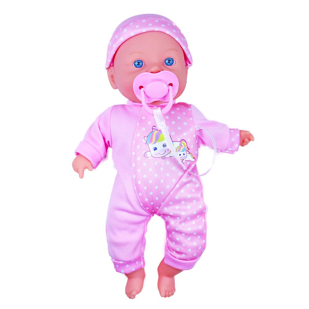 Senzační panenka miminko, která vydává různé zvuky. Vytažením dudlíku z úst panenky začne plakat, vložením dudlíku zpět vydává zvuk cumlání. Panenka má měkké bříško a obsahuje 3 ks baterií typu AG13/LR44. Velikost panenky je cca 31 cm.