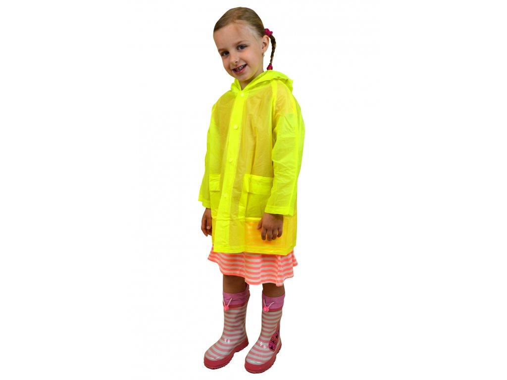 Pláštěnka pro děti i dospělé je neonové žluté barvě. Materiál pláštěnky: 100% PVC. Zapínání na cvočky, kapuce.
