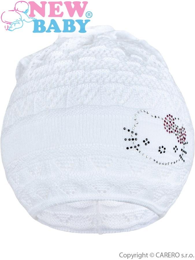 Detská čiapka v biele farbe s mačičkou. Jarná pletená čiapočka - šátek New Baby. Čiapočku pre dievčatá zdobí obrázok mačičky s trblietavými kamienkami. Detské oblečenie je 100% bavlna. Materiál je pružný. Obvod okolo hlavičky cca 40-50 cm.