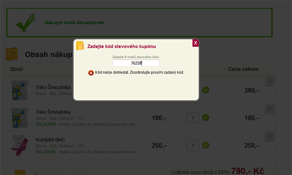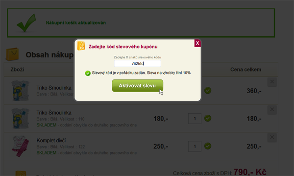 Pokud tedy vlastníte jeden z těchto slevových kódů, nic Vám nebrání jej použít právě pro dnešní objednávku.Stačí jej zadat v nákupním košíku po kliknutí na odkaz "Zadat kód slevového kupónu". V otevřeném okýnku zadejte kód do políčka. Pokud je kód správný, ihned se Vám zobrazí tlačítko pro aktivaci daného kódu. V zápětí v nákupním košíku vidíte procentní slevu, na kterou máte díky slevovému kódu nárok a taky se ihned daná sleva odečte od celkové částky za nákup.