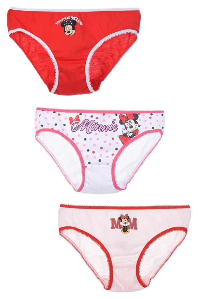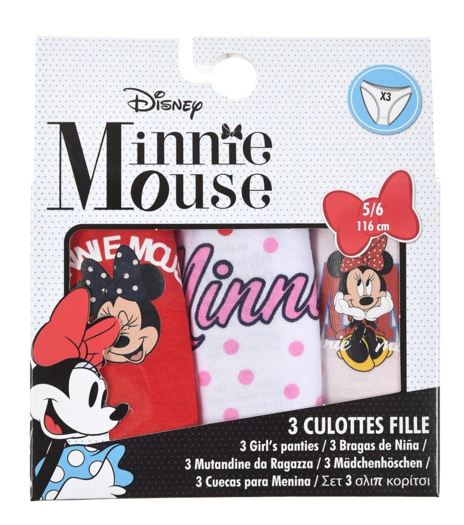 Stylová sada tří dívčích kalhotek s oblíbeným motivem Minnie Mouse od Disney. Každý kus má jiný potisk – od jemné růžové po sytě červenou. Vyrobeny ze 100% bavlny pro maximální pohodlí a prodyšnost. Vhodné pro každodenní nošení, zabalené v originální krabičce. Skvělý dárek pro malé slečny, které milují Minnie!