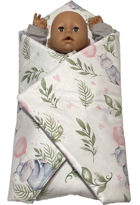 Dětská zavinovačka pro panenky Hrošíci baby. Rychlozavinovačka pro panenky vyrobena ze 100% Bavlny, výplň ze 100% Polyesteru je pevně všitá uvnitř, zapínání na suchý zip, možno prát na 30°C, ušito v ČR. Materiál: 100% Bavlna, výplň: 100% Polyester. Rozměr: 1x 60x60 cm.