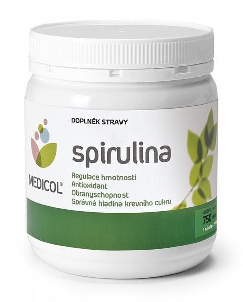 Spirulina 750 tablet. SPIRULINA značky MEDICOL je druh sladkovodnej riasy, ktorá obsahuje množstvo vitamínov, minerálov, aminokyselín a je bohatým zdrojom bielkovín. Z radu vitamínov sú vo väčšom množstve zastúpené vitamíny A, B12 a tiamín.