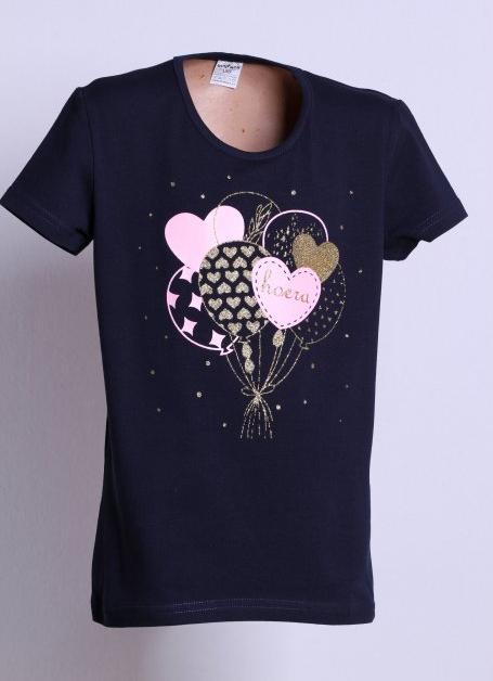 Dívčí triko s krátkým rukávem v barvě tmavě modré z příjemného bavlněného jednolícního úpletu s elastanem. Na předním díle moderní dívčí tisk balónků aplikovaný novou technologií 3D tisku oživen zlatou třpytivou barvou. Dětské oblečení je z materiálu 95 % bavlna, 5 % elastan, jednolícní úplet. Kvalitní česká značky Anyface.