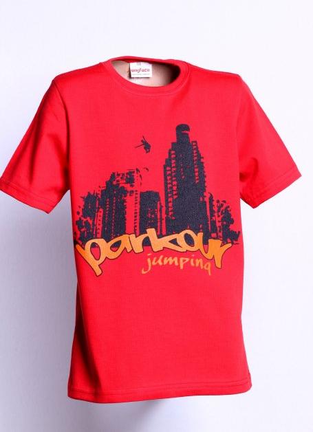 Tričko chlapecké PARKOUR jumping s krátkým rukávem červené barvy z příjemného bavlněného jednolícního úpletu. Tričko je klasického střihu. Na předním díle moderní chlapecký černo-oranžový tisk PARKOUR aplikovaný novou technologií 3D tisku