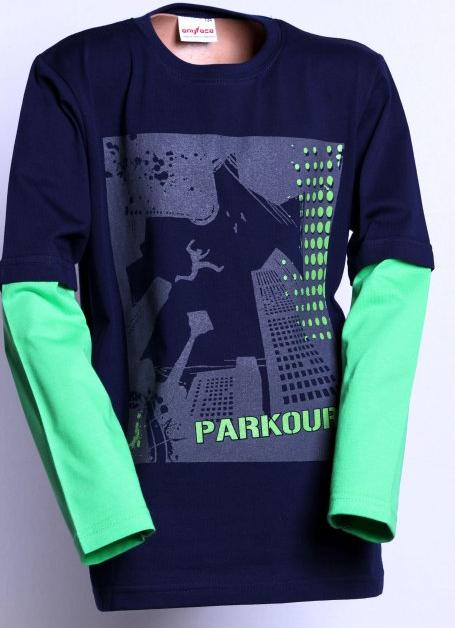 Tričko chlapecké PARKOUR s dlouhým rukávem tmavě modré barvy v kombinaci se zelenou. Dětské oblečení je z příjemného bavlněného úpletu, 100% bavlna. Tričko je klasického střihu v kombinaci krátko-dlouhý rukáv. Na předním díle moderní chlapecký stónovaný tisk PARKOUR.
