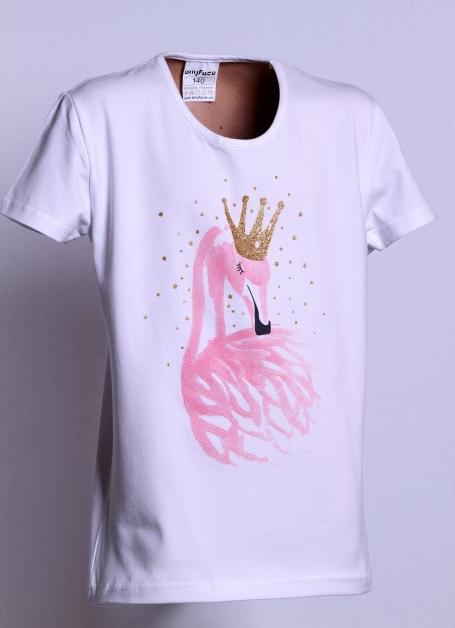 Tričko dívčí s krátkým rukávem v barvě bílé z příjemného pružného bavlněného jednolícního úpletu s elastanem. Na předním díle moderní dívčí růžový tisk plameňák aplikovaný novou technologií 3D tisku oživen zlatou třpytivou barvou. Dětské oblečení české značky Anyface - Kilian.