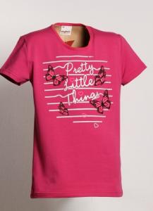 Tričko pre dievčatá s krátkym rukávom. Detské oblečenie je v ružovej farbe z príjemného bavlneného jednolícního úpletu s elastanom - 95% bavlna, 5% lycra. Na prednom diele trička je moderná dievčenská tlač motýlikov oživený ružovou farbou aplikovanú novou technológiou 3D tlače. Priekrčník je ozdobne obšitý vo farbe tlači. Detské tričko českej značky Anyface - Kilian.