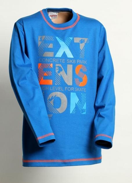 Detské tričko Extension je modré farby z príjemného bavlneného úpletu. Detské oblečenie s dlhým rukávom je 100% bavlna, jednolícny úplet. Tričko je klasického strihu. Na prednom diele trička je športová tlač v pestrých fosforujúce farbách. Dĺžka tričká, rukávy a priekrčník sú ozdobne prešity do farby tlače. Detské oblečenie od známe české značky Anyface - Kilian.